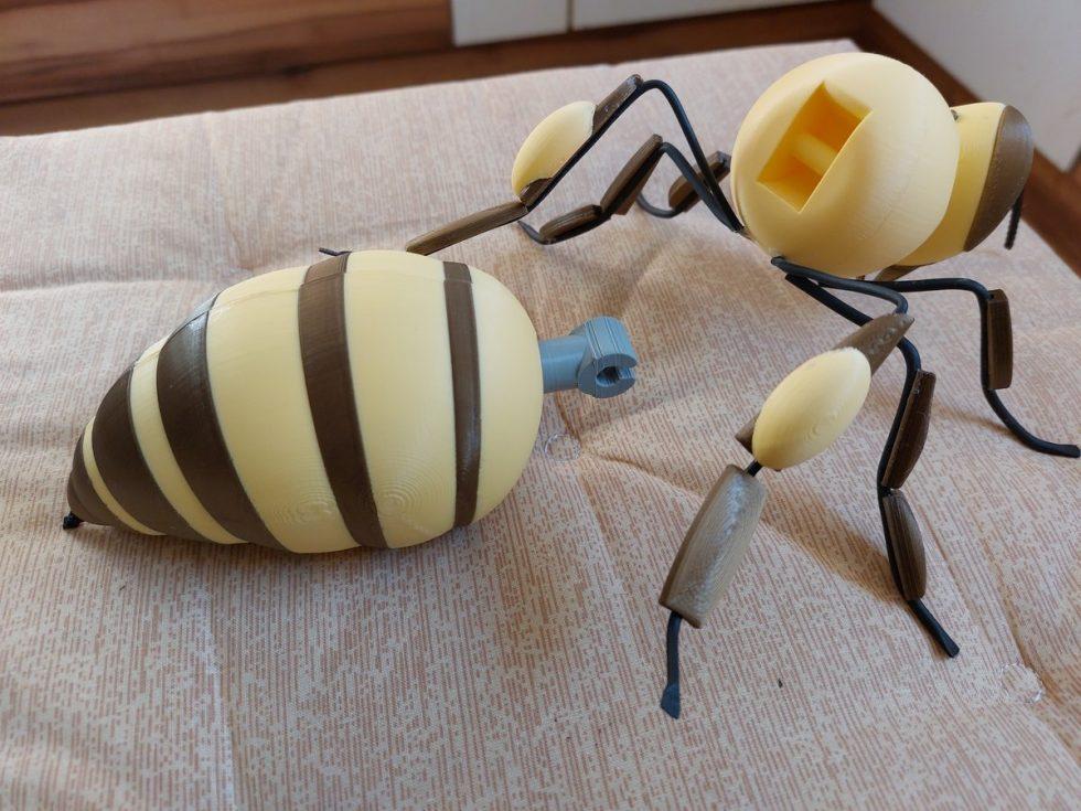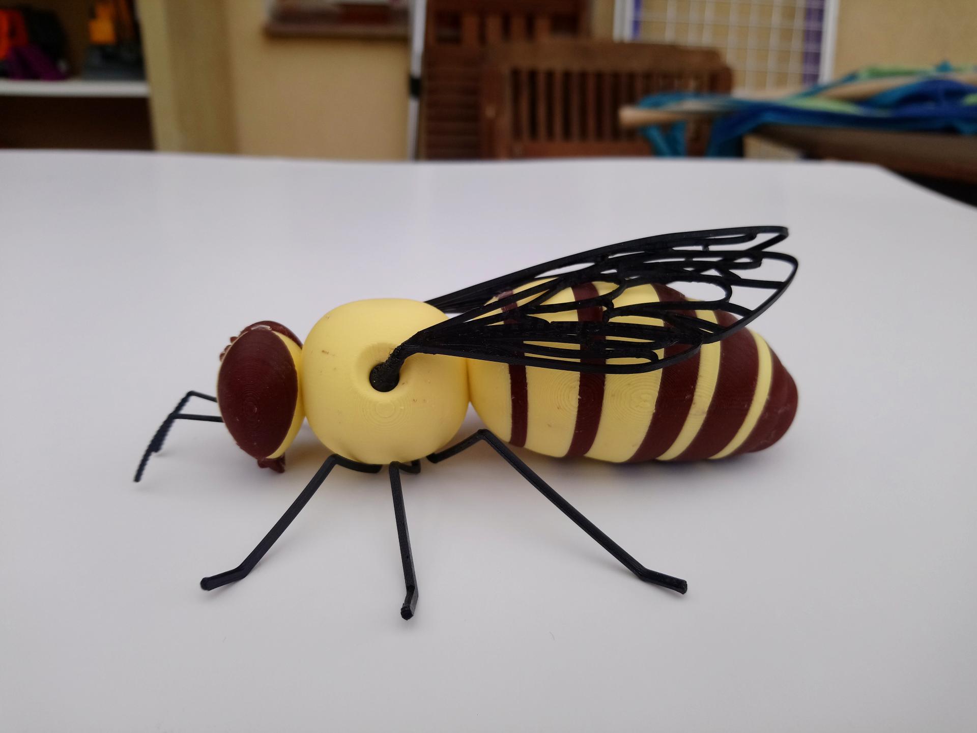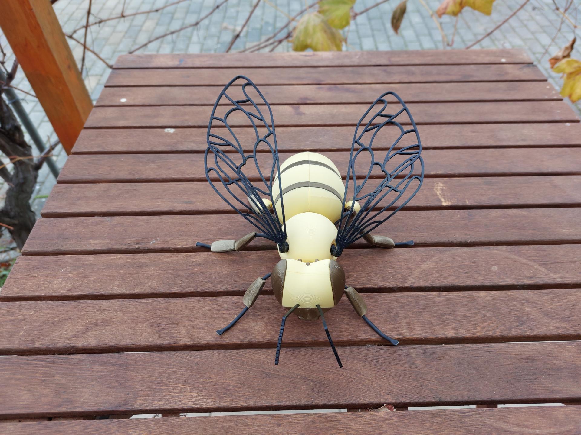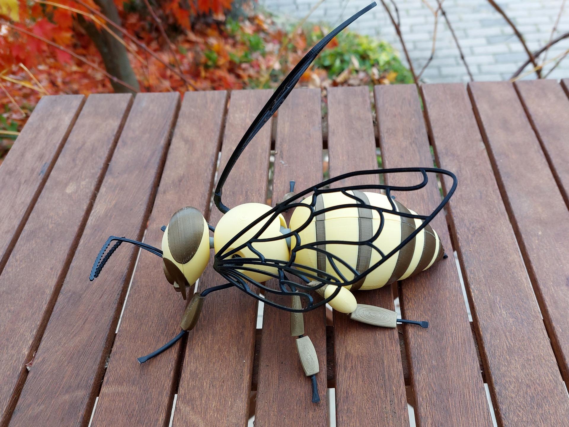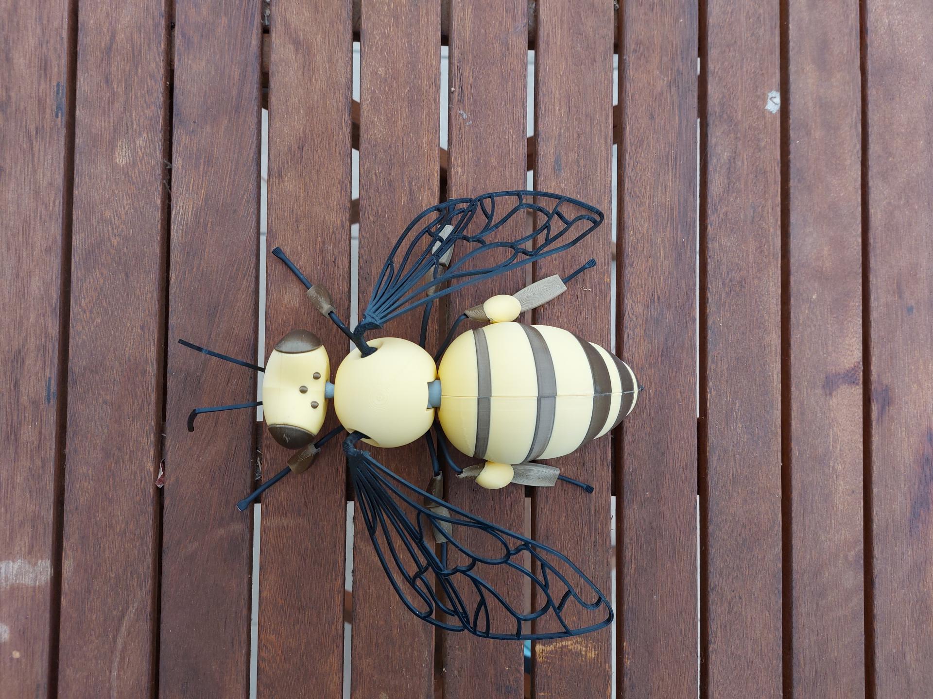Materialien: PLA (Kopf, Brust, Hinterleib, Korb, Füße) + TPU (Flügel, Tentakel, Stachel) + Inox Draht mit Schrumpfschlauch und PLA-Elementen (Füße)