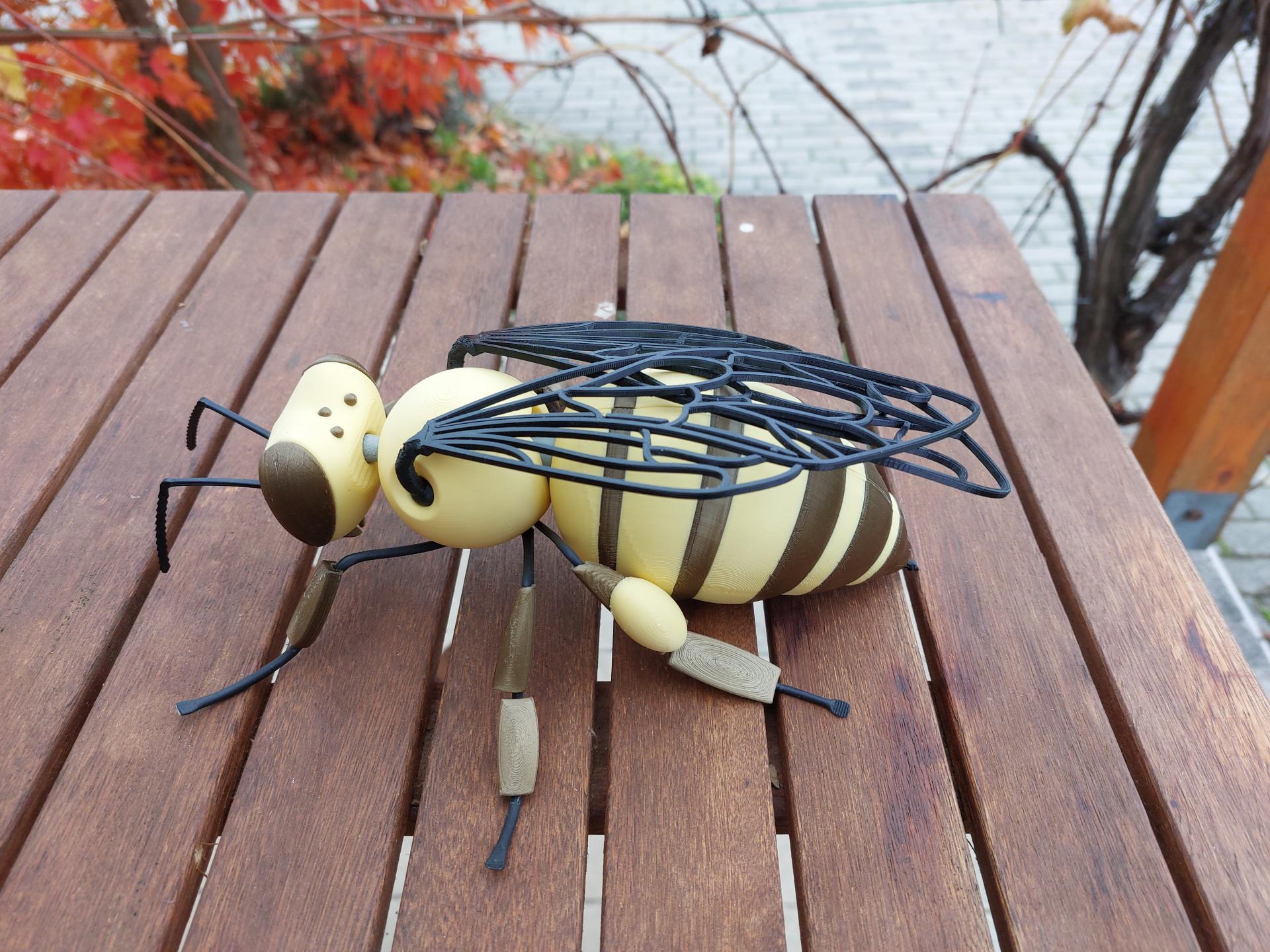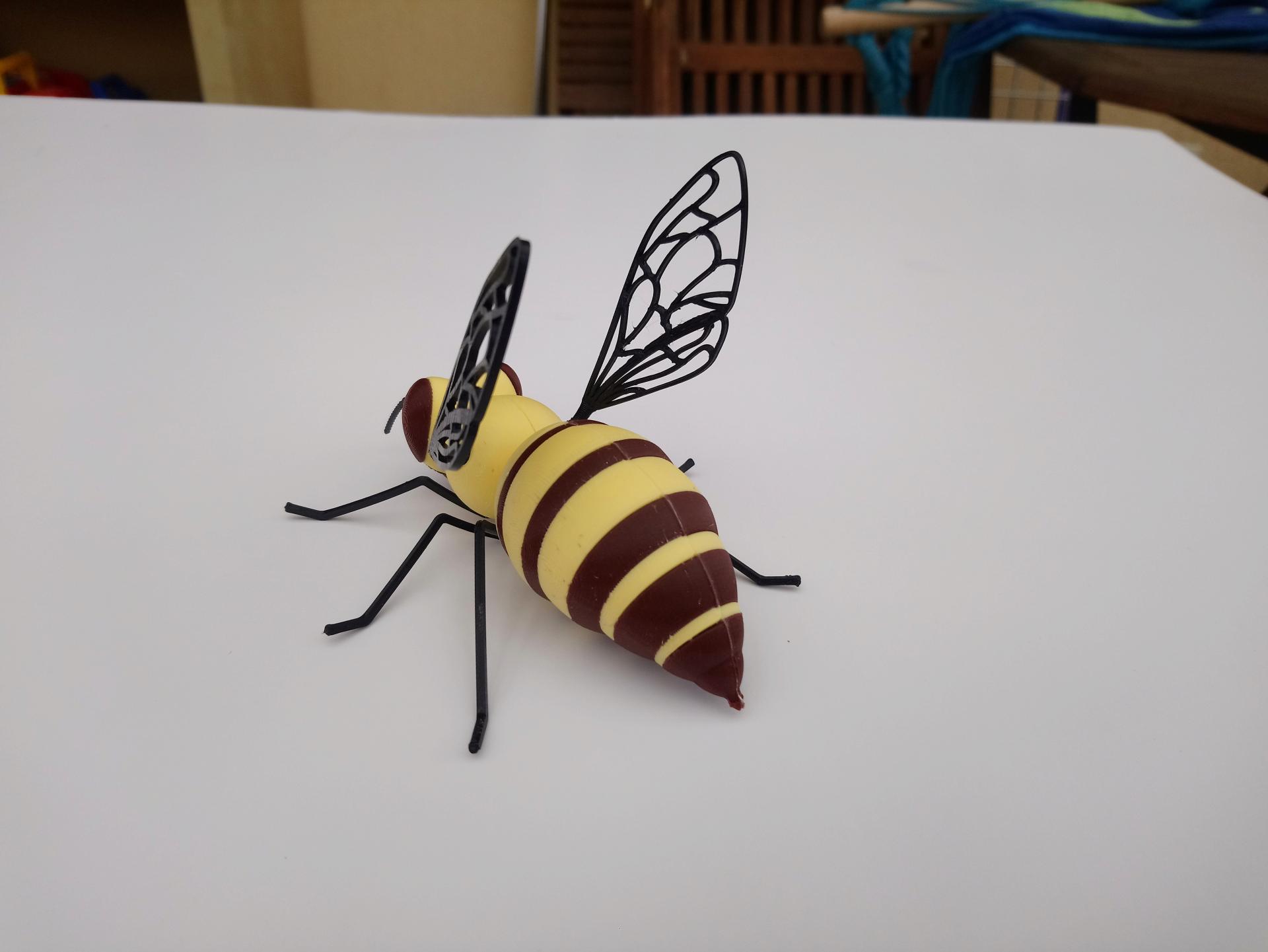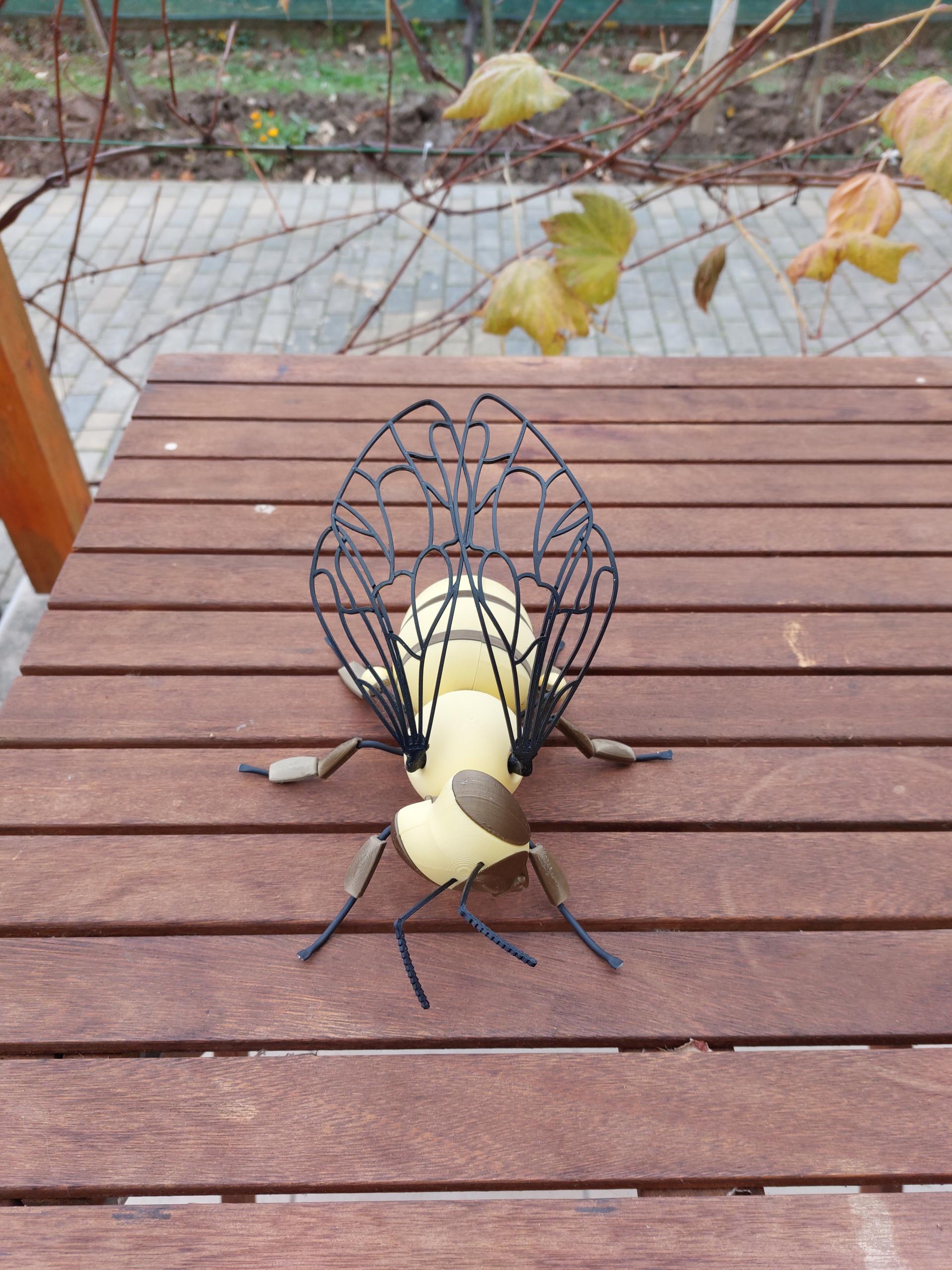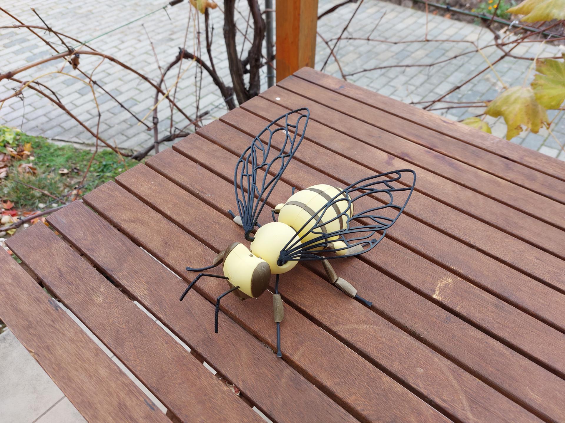 Materialien: PLA (Kopf, Brust, Hinterleib, Korb, Füße) + TPU (Flügel, Tentakel, Stachel) + Inox Draht mit Schrumpfschlauch und PLA-Elementen (Füße)