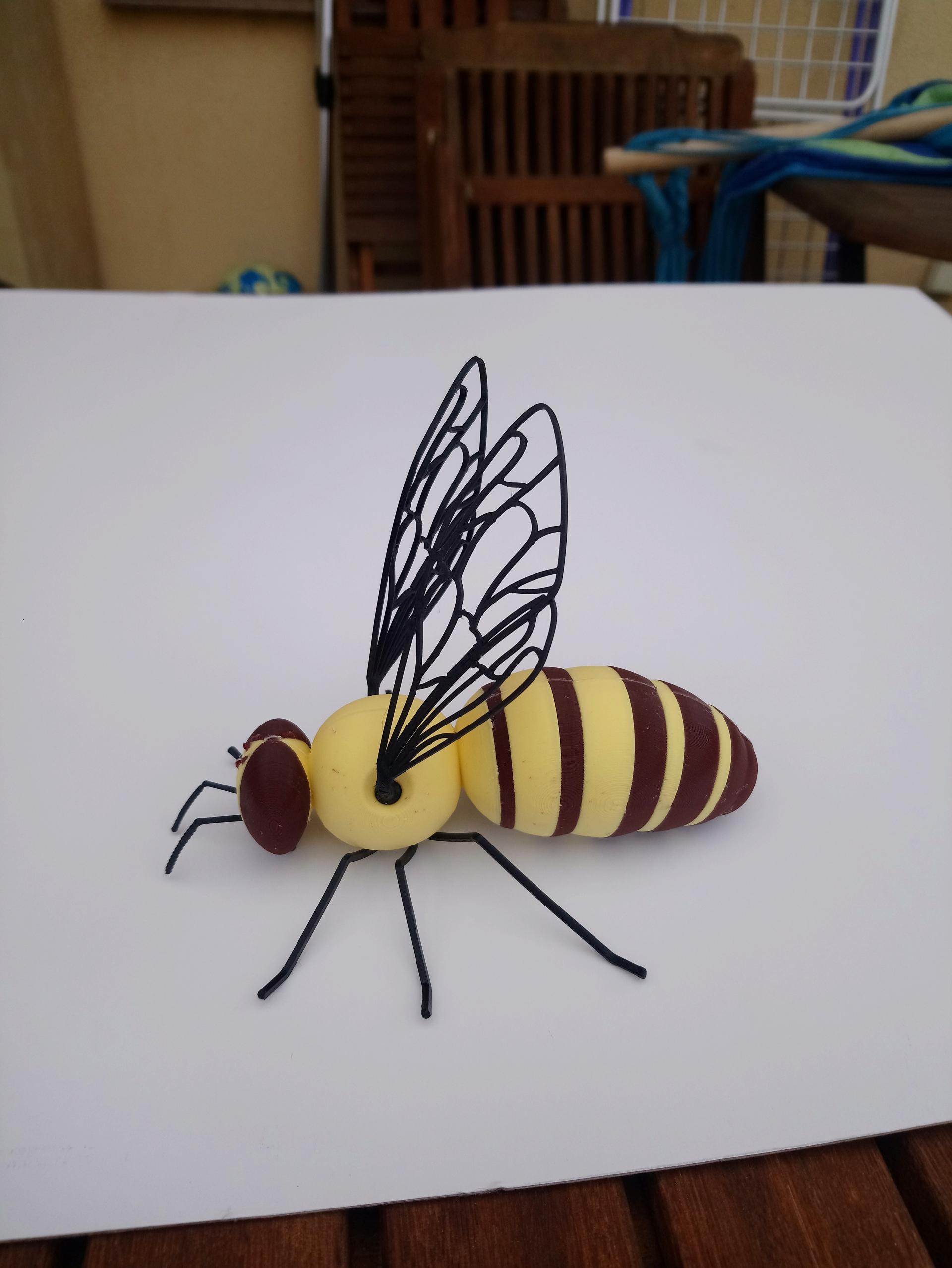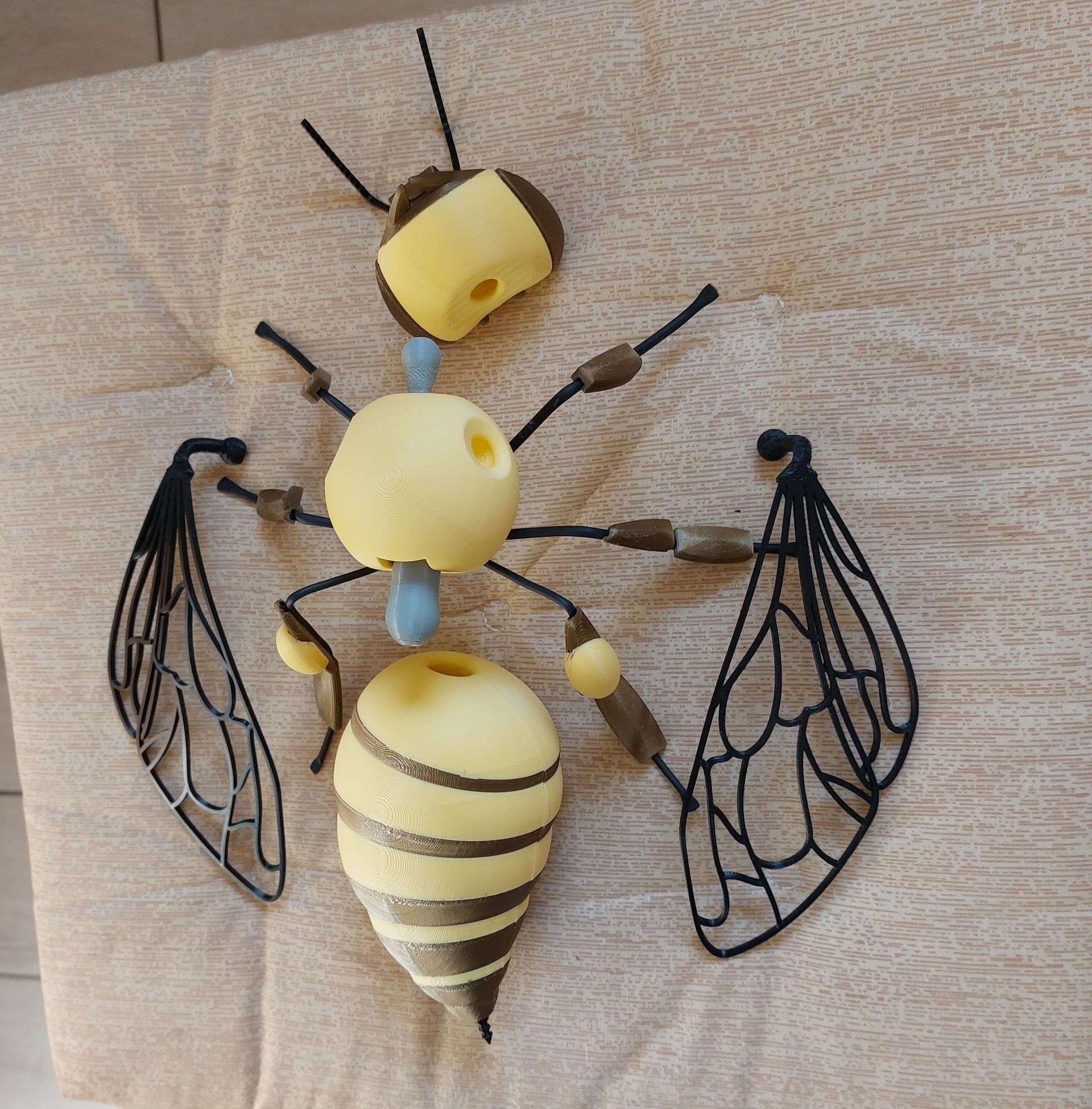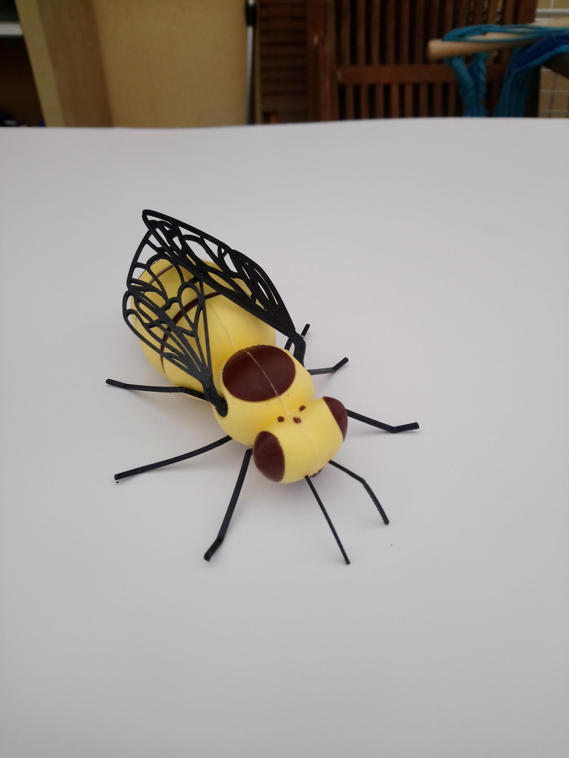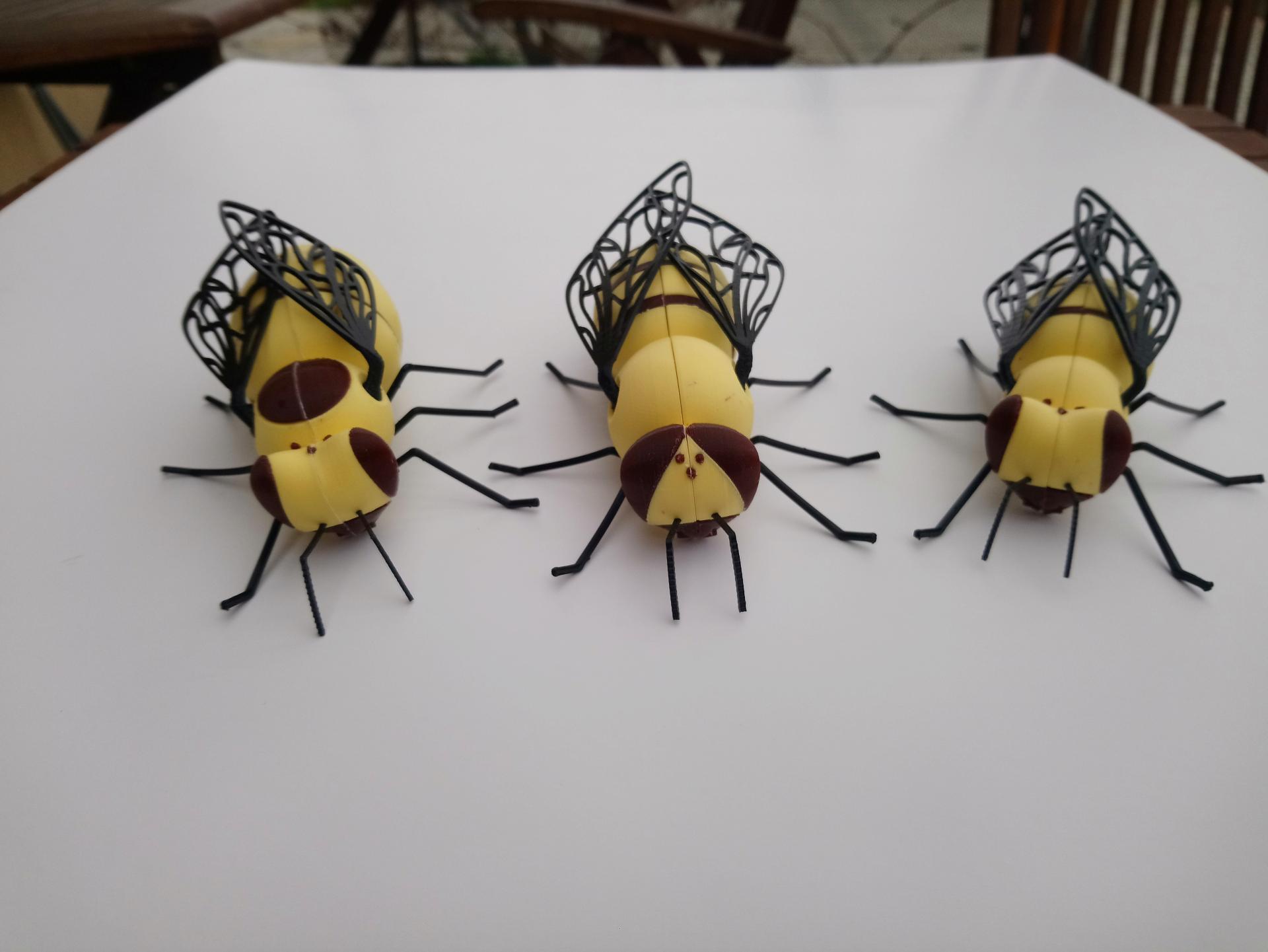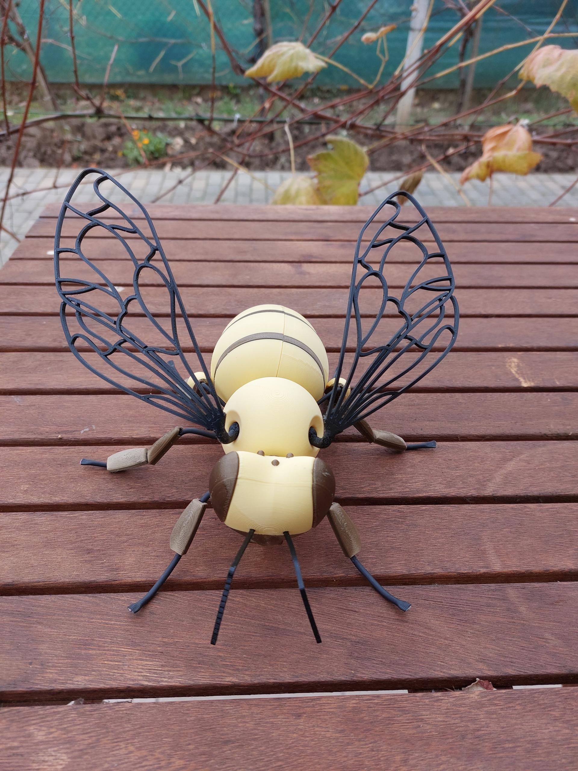 Materialien: PLA (Kopf, Brust, Hinterleib, Korb, Füße) + TPU (Flügel, Tentakel, Stachel) + Inox Draht mit Schrumpfschlauch und PLA-Elementen (Füße)