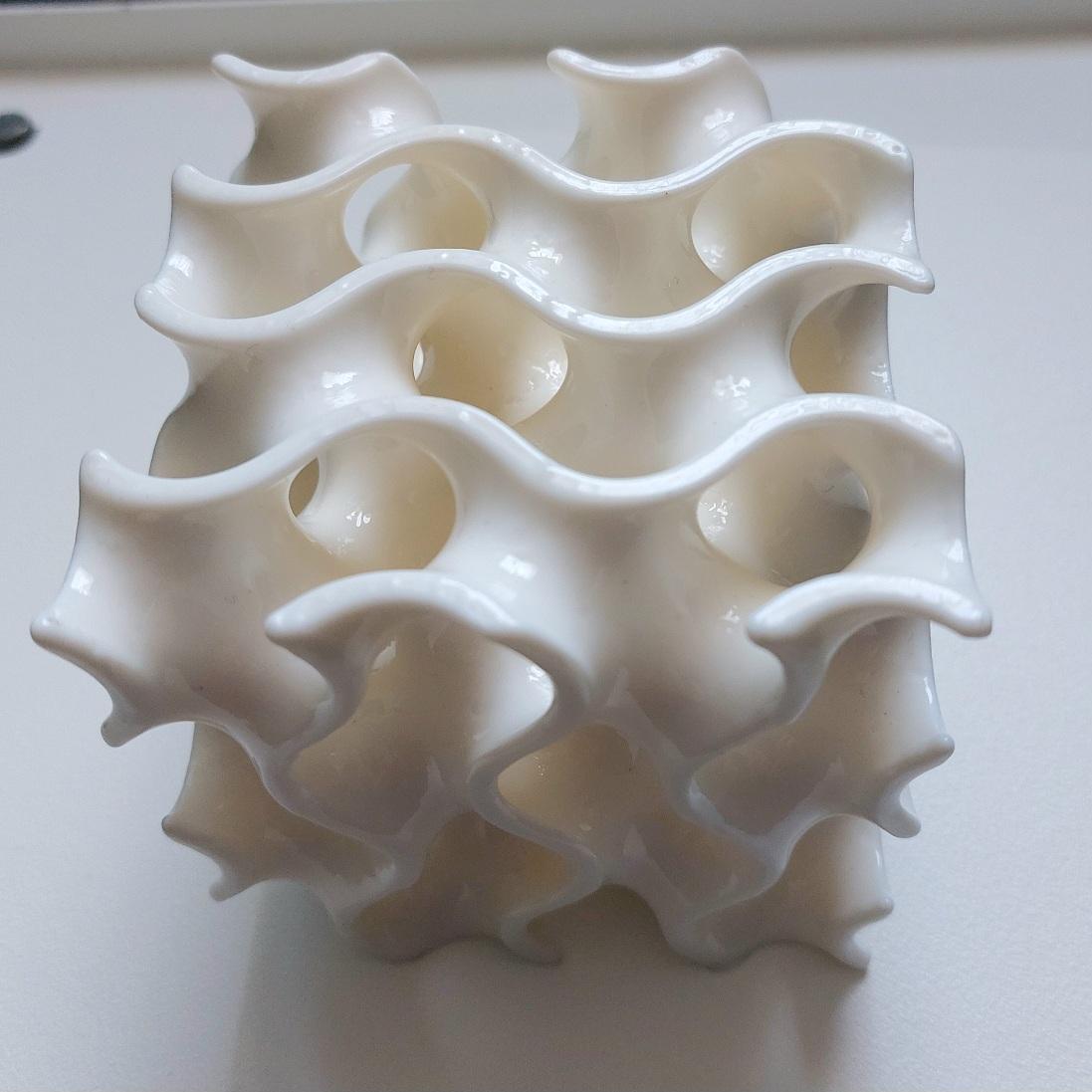 Ein Gyroid ist eine mathematisch beschreibbare, unendlich stetige, dreifach periodische Minimalfläche, die in der Polymertechnologie und Biologie als umfängliche Grenzfläche auftritt. Im 3D-Druck wird sie üblicherweise als innere Füllung mit eins Schichtdicke, und unterschiedlicher Strukturdichten verwendet. Sie absorbiert Belastungen aus verschiedenen Richtungen gut und ist, bei Verwendung des geeigneten Materials, flexibel. Nicht zuletzt ist sie auch ästhetisch ansprechend. Das unten abgebildete Objekt besteht aus PVB (Polyvinylbutyral), das sich chemisch glätten lässt und dadurch eine schöne, glänzende Oberfläche erhält.